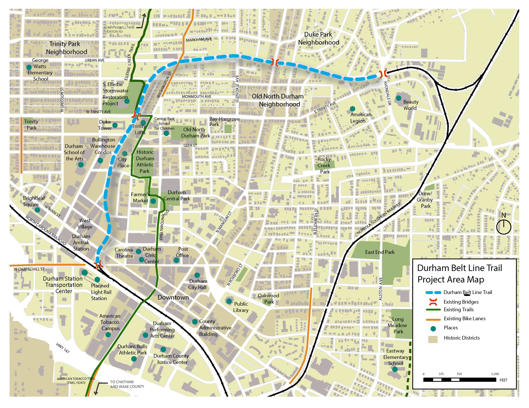 The 1.8-mile Durham Rail Trail will serve as a new pedestrian and bicycle corridor that links neighborhoods, businesses, parking and residents to the evolving downtown and nightlife. The proposed amenities will include overlook views to urban and open space vistas, vegetated parklike character with site furniture, cultural public art displays, programmable urban opportunities and connection to adjacent developments. In addition, the trail corridor reclaims a portion of the unused Norfolk and Southern rail bed that connects Avondale Ave in North Durham to the Durham Station multimodal transportation hub.